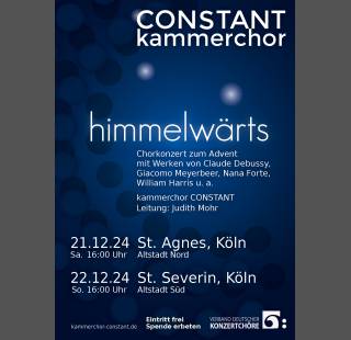 Der Kammerchor CONSTANT strebt in diesem Jahr mit seinem Adventskonzert „himmelwärts“. Der Advent ist traditionell eine Zeit der Sehnsucht nach Gerechtigkeit, nach Trost und Erlösung durch die Geburt Jesu. Es ist eine Zeit des verheißungsvollen Wartens, das seit jeher die Menschen durch eine dunkle Zeit getragen hat. Durch die Jahrhunderte hinweg sind zahlreiche Adventstexte und Vertonungen von dieser Thematik geprägt worden. Dabei ist der Himmel das zentrale Bild fur die Hoffnung auf die Ankunft des Herrn. In Chorwerken unter anderem von Giacomo Meyerbeer, Nana Forte, Albert Becker und William Harris widmet sich der Kammerchor CONSTANT dieser Sehnsucht kurz vor dem Weihnachtsfest.